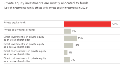 UBS bankas dati par 2023. gadu liecina, ka ieguldījumi privātajā kapitālā ir galvenais ģimenes biroju ieguldīšanas veids, vidēji līdz 56% līdzekļu ieguldot fondos un vēl 8% fondu fondos. Tā kā fondi nodrošina diversifikāciju un iespēju ienākt tirgos, kur ģimenes birojam nav savas pieredzes, īpaši, ja runa ir ne tikai par materiālo vērtību, bet arī par sociālo pievienoto vērtību, piemēram, ESG standartiem.